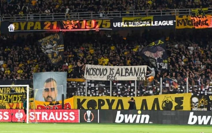 “Kosova është Shqipëri”, shkruhej në transparentin e vendosur nga tifozët grekë.
