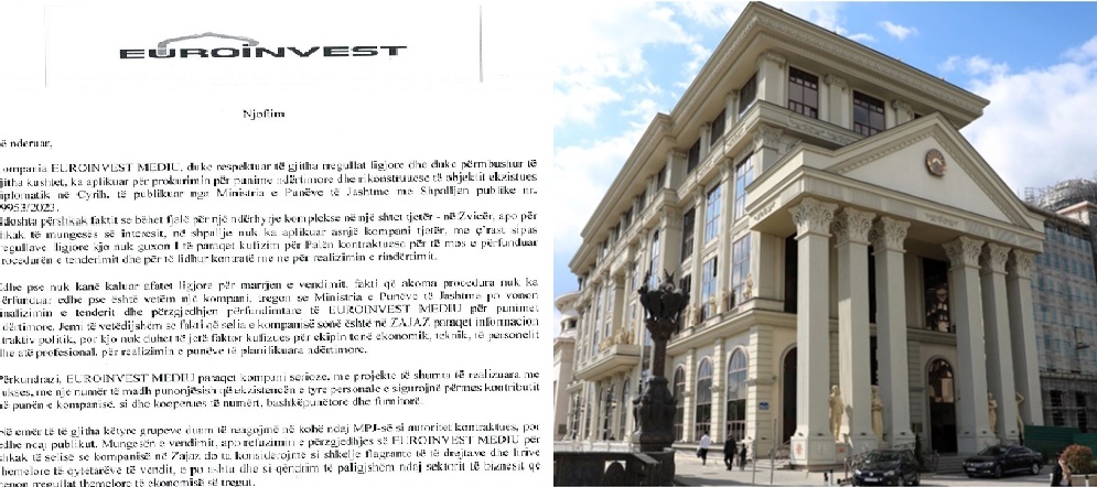 Kompania “Euroinvest Mediu” me seli në fshatin Zajas reagon sot përmes një letre drejtuar mediave për zvarritjen e procedurës së tenderit nga Ministria e Jashtme për përzgjedhjen e një kompanie që duhet të kryejë rikonstruksionin e një godine diplomatike në Cyrih, të Zvicrës