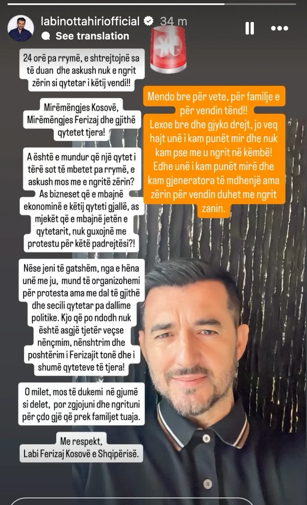 Këngëtari i njohur Labinot Tahiri ka reaguar me ashpërsi pas ndërprerjes së rrymës elektrike që, sipas tij, la për 24 orë qytetin e Ferizajt dhe shumë qytete të tjera pa energji elektrike.