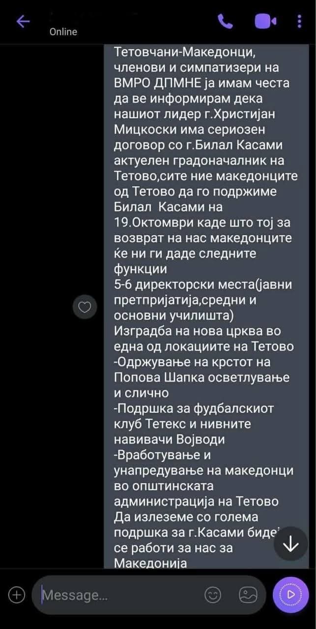 Një mesazh telefoni po qarkullon me shpejtësi në grupet e maqedonasve të Tetovës, në të cilin bëhet thirrje për mbështetje ndaj kryetarit aktual të komunës, Bilall Kasami, në zgjedhjet lokale të 19 tetorit.