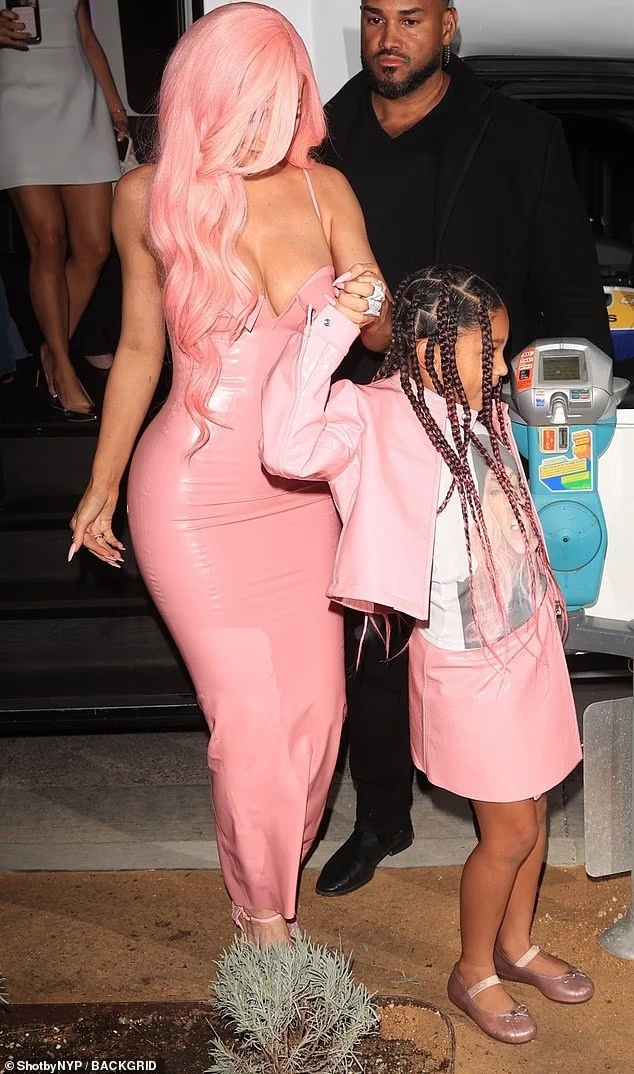 Në krah të saj ishte vajza 7-vjeçare Stormi, e cila kishte veshur një fund dhe xhaketë rozë që përputheshin me look-un e nënës. Ajo kishte kombinuar veshjen me një bluzë të printuar dhe këpucë të sheshta rozë.