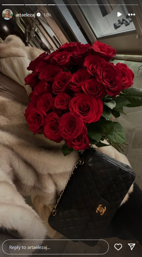 Ajo në rrjetet e saj sociale ka publikuar një foto ku shihet duke mbajtur në dorë një buqetë me lule, trëndafila të kuq, të cilat simbolizojnë dashurinë.