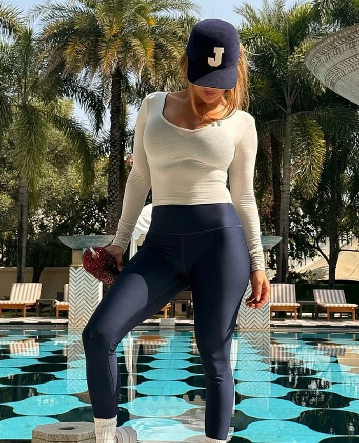 Në një selfie nga afër, ylli i showbiz-it mbante një kapelë bejsbolli blu me një ‘J’ të bardhë, ndërsa një fotografi tjetër e tregonte me geta të ngushta blu dhe një këmishë të bardhë me mëngë të gjata, që nxirrnin në pah dekoltenë e saj.