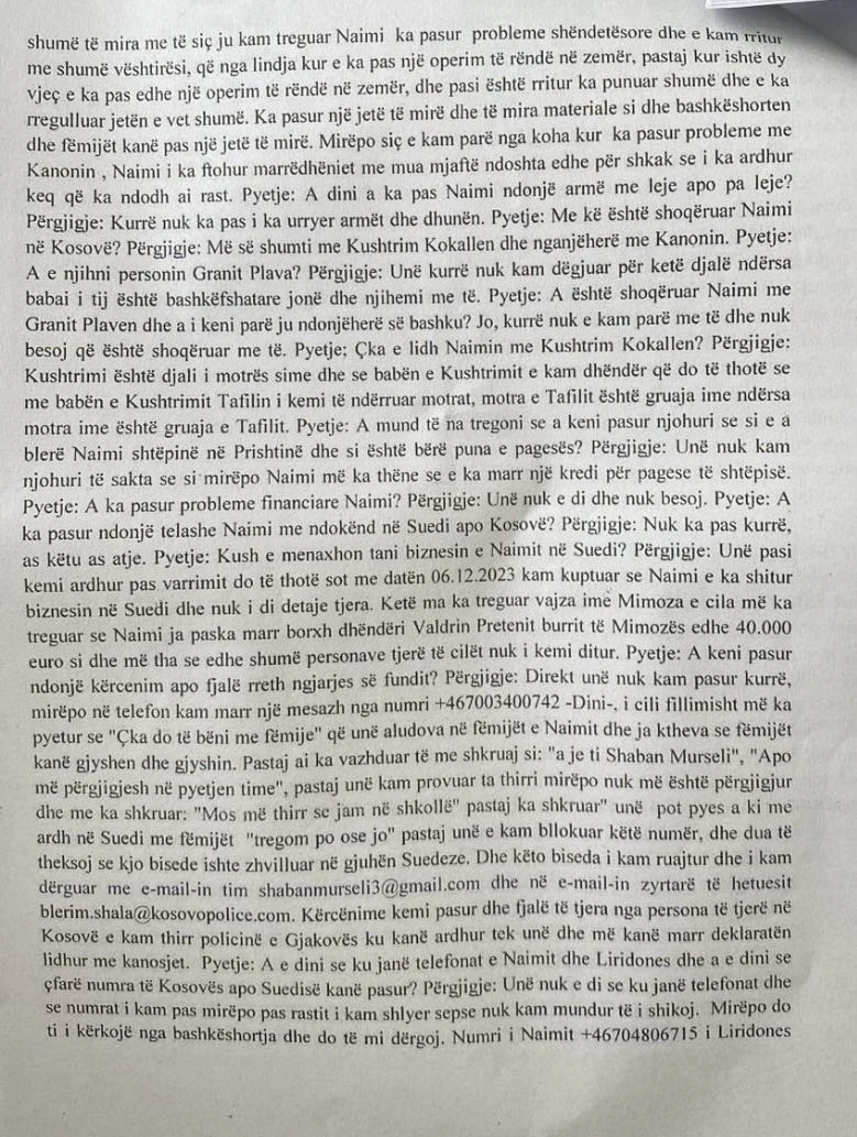 “Më ka thirr djali i dytë Mërgimi e më pyeti ‘babë a ke fol me Naimin se po thonë se e kanë vra Lilin’, ndërsa unë jam shokuar nga ky lajm. E kam thirr bashkëshorten time dhe e kam pyetur se çka ka ndodh dhe i kam treguar, pastaj pas një kohe jemi takuar së bashku me bashkëshorten Sanijen, vëllain Asllanin dhe me bashkëshorten e tij Fatmiren, djalin Mërgimin ditën më 1.12.2023 në veturë ku kemi udhëtuar për Kosovë diku 40 orë dhe kemi arritur më 3.12.203 në orët e mëngjesit te Naimi ku kemi biseduar shumë gjatë me gjithë familjen”, ka thënë në dëshminë Murseli.