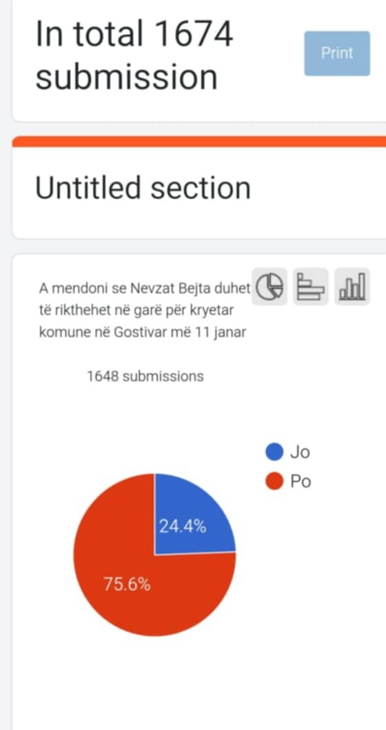 Në pyetjen: “A mendoni që Nevzat Bejta duhet të rikthehet në garë për kryetar komune në Gostivar më 11 Janar?”, 75.6% e të anketuarve thanë “Po”, ndërsa 24.4% deklaruan “Jo”.