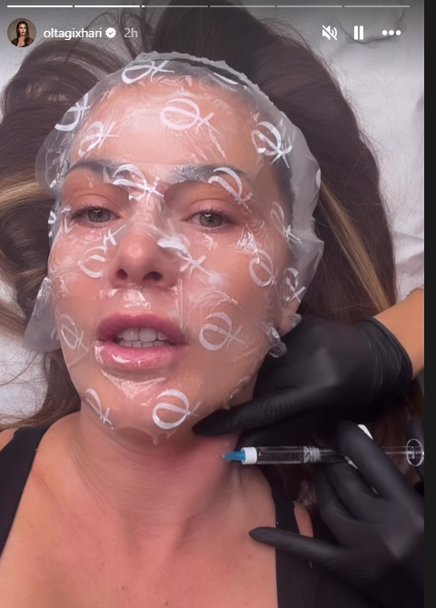 Në imazh, Olta duket e qetë teksa një profesionist kryen një ndërhyrje minimale në zonën e fytyrës, duke lënë të kuptohet se bëhet fjalë për një procedurë estetike, trajtim kundër rrudhave.