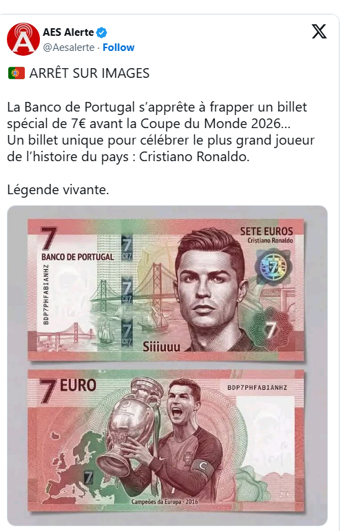Banka e Portugalisë po përgatitet të publikojë një kartëmonedhë krejtësisht të veçantë me vlerë 7 euro, një edicion unik që pritet të tërheqë vëmendjen e botës para Kupës së Botës 2026.