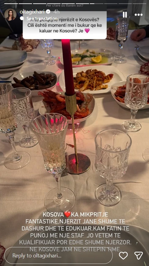 Aktorja e njohur shqiptare, Olta Gixhari, ka ndarë së fundmi përvojat e saj në Kosovë gjatë një sesioni pyetje-përgjigje në Instagram.
